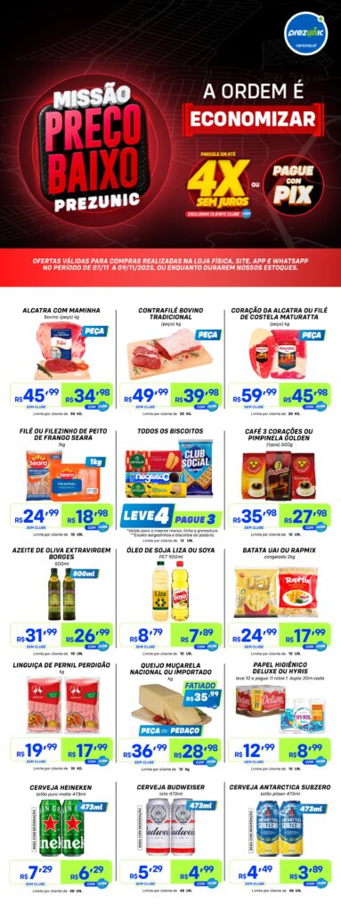 No Prezunic, encontre ofertas em bebidas, açougue, padaria e mais. Confira os destaques do encarte e aproveite preços baixos em diversos setores da loja. Descontos válidos por tempo limitado!